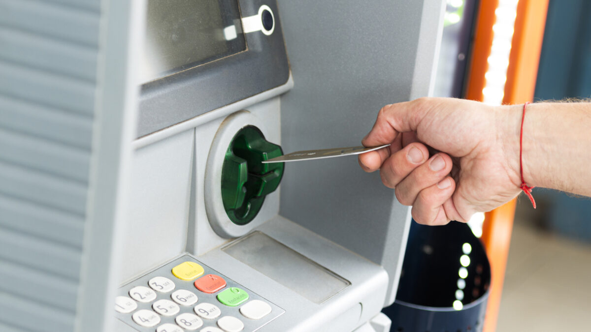 Human hand inserting a credit card into an ATM to withdraw money