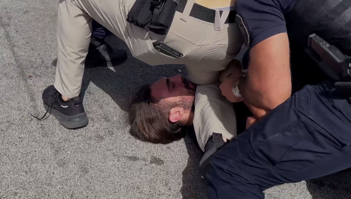 Το υλικό, που ήδη κυκλοφορεί και στα μέσα κοινωνικής δικτύωσης, δείχνει τον άνδρα με πολιτικά να γονατίζει στον λαιμό του διαδηλωτή, επαναφέροντας στη μνήμη εικόνες που θυμίζουν τη δολοφονία του Τζορτζ Φλόιντ στις ΗΠΑ το 2020.