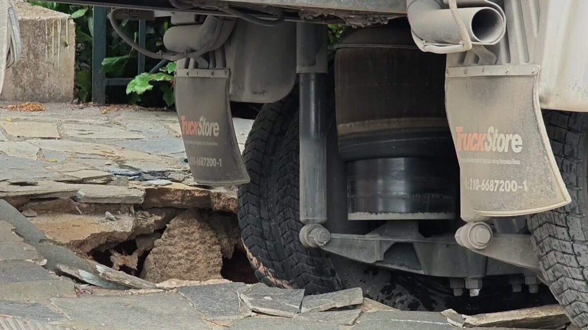 Φορτηγό βούλιαξε σε τρύπα στο κέντρο της Αθήνας – Υποχώρησε το έδαφος