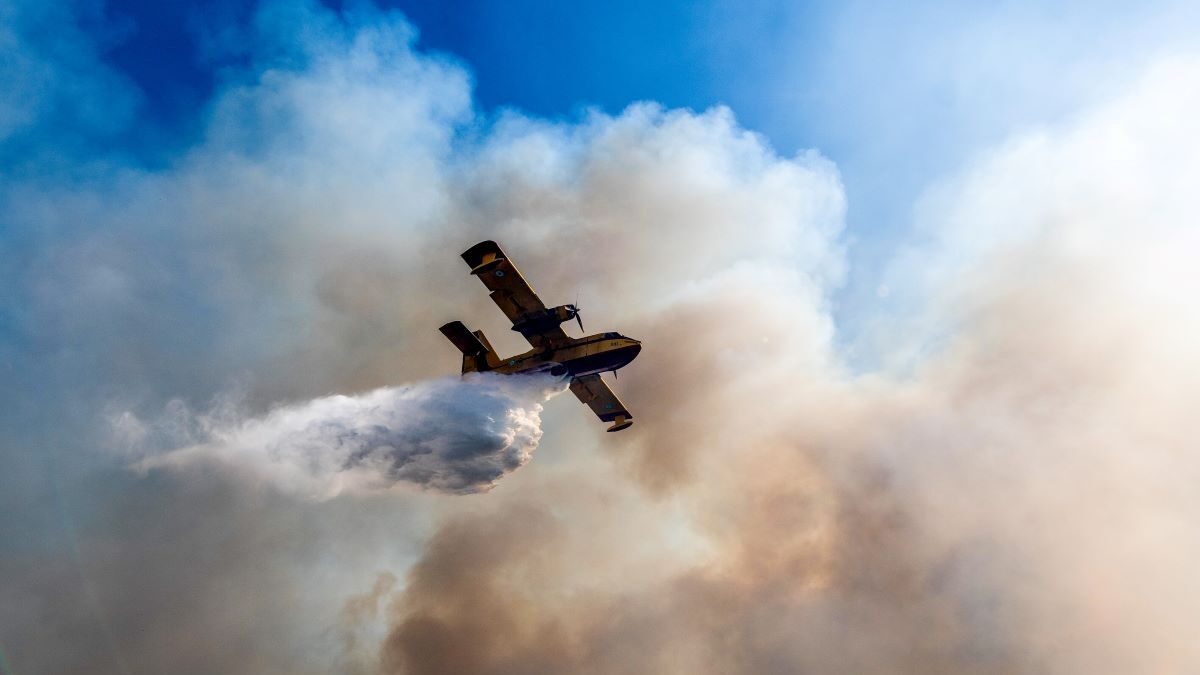 Από αέρος επιχειρούν δύο αεροσκάφη που πραγματοποιούν ρίψεις νερού.