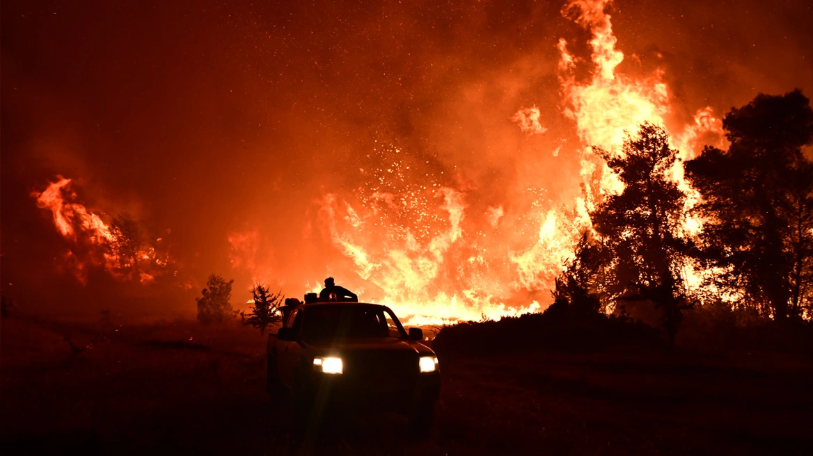 Μάχη να μην περάσει στο Συκάμινο: Από τις 21:30 οι επίγειες δυνάμεις προσπαθούν να περιορίσουν τη φωτιά πριν προσεγγίσει κατοικημένες περιοχές, με τα εναέρια μέσα να έχουν σταματήσει λόγω νύχτας.