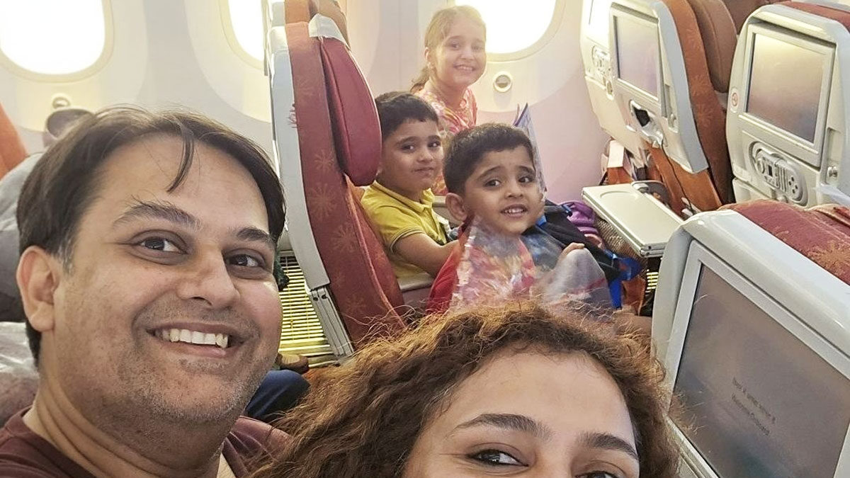 Η selfie, που τράβηξε ο Δρ Joshi, δείχνει τον ίδιο και τη σύζυγό του να κάθονται στη μία πλευρά, χαμογελαστοί, και τα μικρά δίδυμα αγόρια τους και τη μεγαλύτερη κόρη τους να κάθονται απέναντι στο διάδρομο, επίσης με τεράστια χαμόγελα στα πρόσωπά τους.