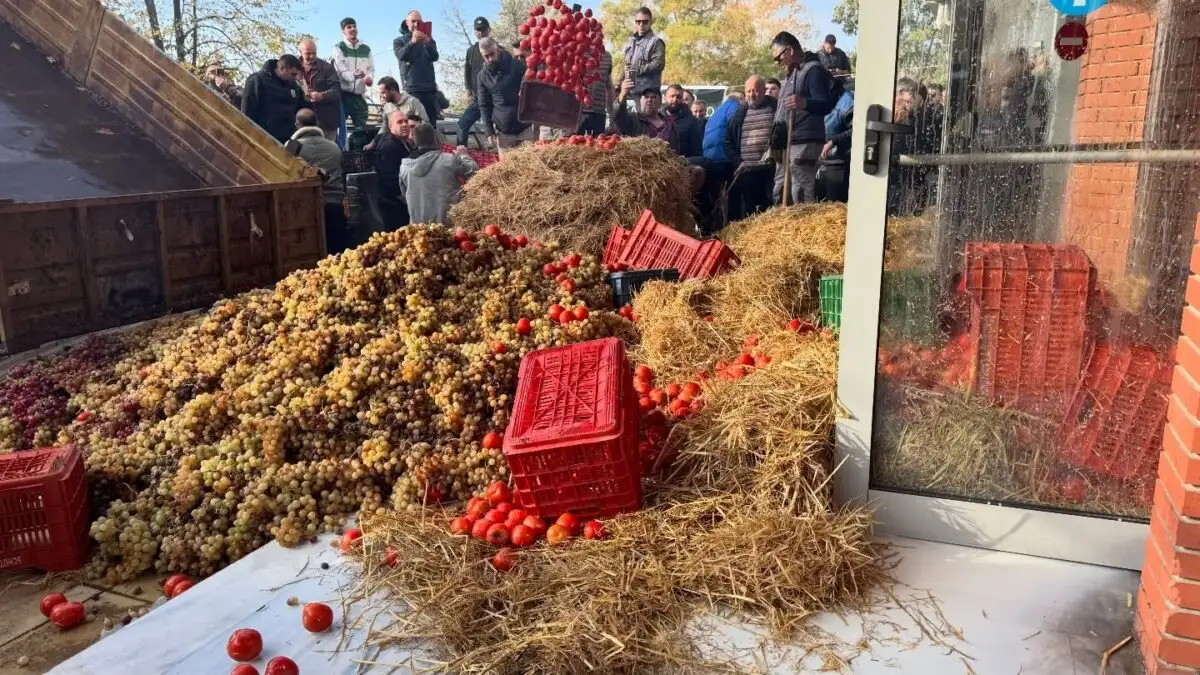 Οι αγρότες διαμαρτυρόμενοι απέκλεισαν σήμερα τα δύο κτίρια και διαμαρτύρονται πετώντας ντομάτες και σταφύλια, καίγοντας άχυρα και σπρώχνωντάς τα μέσα στα κτίρια, αλλά και ρίχνοντας γάλα, ντομάτες και σταφύλια.