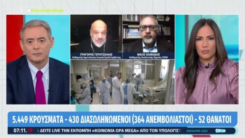 Μέσα σε λίγες μέρες οι περισσότερες περιφέρειες της χώρας «κοκκίνησαν», με τα νοσοκομεία τους να «γονατίζουν». Εδώ και μέρες δεν υπάρχει καμία κενή κλίνη εντατικής σε Θεσσαλονίκη, Θεσσαλία, Στερεά Ελλάδα και Δυτική Μακεδονία. Η μία κλίνη μετά την άλλη καταλαμβάνεται από ανεμβολίαστους ασθενείς. Τα νέα εργαστηριακά επιβεβαιωμένα κρούσματα της νόσου που καταγράφηκαν τις τελευταίες 24 ώρες είναι 5.449, ενώ 52 συμπολίτες μας έφυγαν από τη ζωή χτυπημένοι από κορωνοϊό. Στην εκπομπή Κοινωνία Ώρα MEGA μίλησαν σχετικά οι κ.κ. Γρηγόρης Γεροτζιάφας, καθηγητής Αιματολογίας στην ιατρική σχολή της Σορβόννης, και Νίκος Θωμαΐδης, καθηγητής αναλυτικής Χημείας στο ΕΚΠΑ.