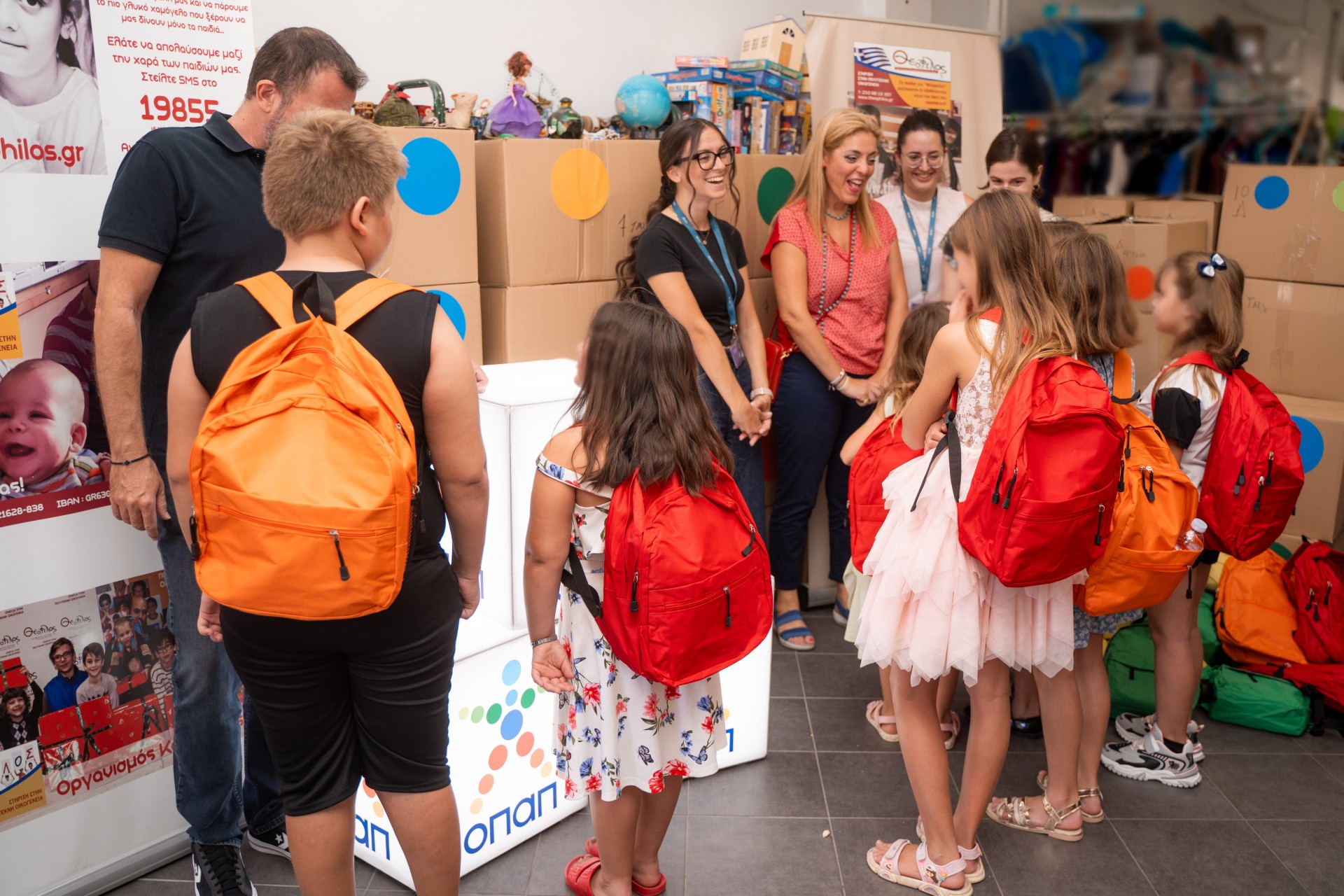 Τις τσάντες με τον σχολικό εξοπλισμό μοίρασαν στα παιδιά, τη Δευτέρα 8 Σεπτεμβρίου, εργαζόμενοι του ΟΠΑΠ οι οποίοι βρέθηκαν στις εγκαταστάσεις του Οργανισμού, στο Γαλάτσι.