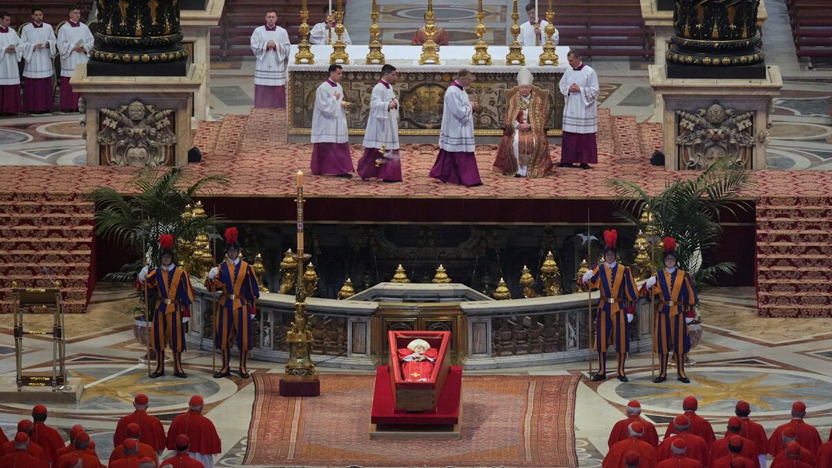 Μετά τη σύντομη λειτουργία που έλαβε χώρα στη Βασιλική του Αγίου Πέτρου, οι καρδινάλιοι απέτισαν φόρο τιμής στον Πάπα Φραγκίσκο.