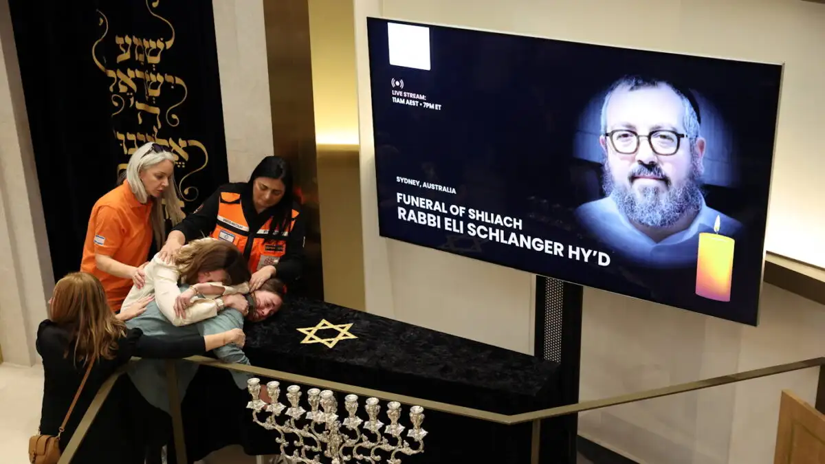Πιστοί υποδέχθηκαν με δάκρυα στα μάτια τη σορό του ραβίνου Έλι Σλάνγκερ, του πρώτου από τα 15 θύματα της επίθεσης που επρόκειτο να κηδευτεί. Ο ραβίνος 41 ετών, ήταν πατέρας πέντε παιδιών, ανάμεσά τους και ένα νεογέννητο. Αρκετοί πολιτικοί ήταν παρόντες στην κηδεία, μεταξύ των οποίων και οι συντηρητικός πρώην πρωθυπουργός Σκοτ Μόρισον.
