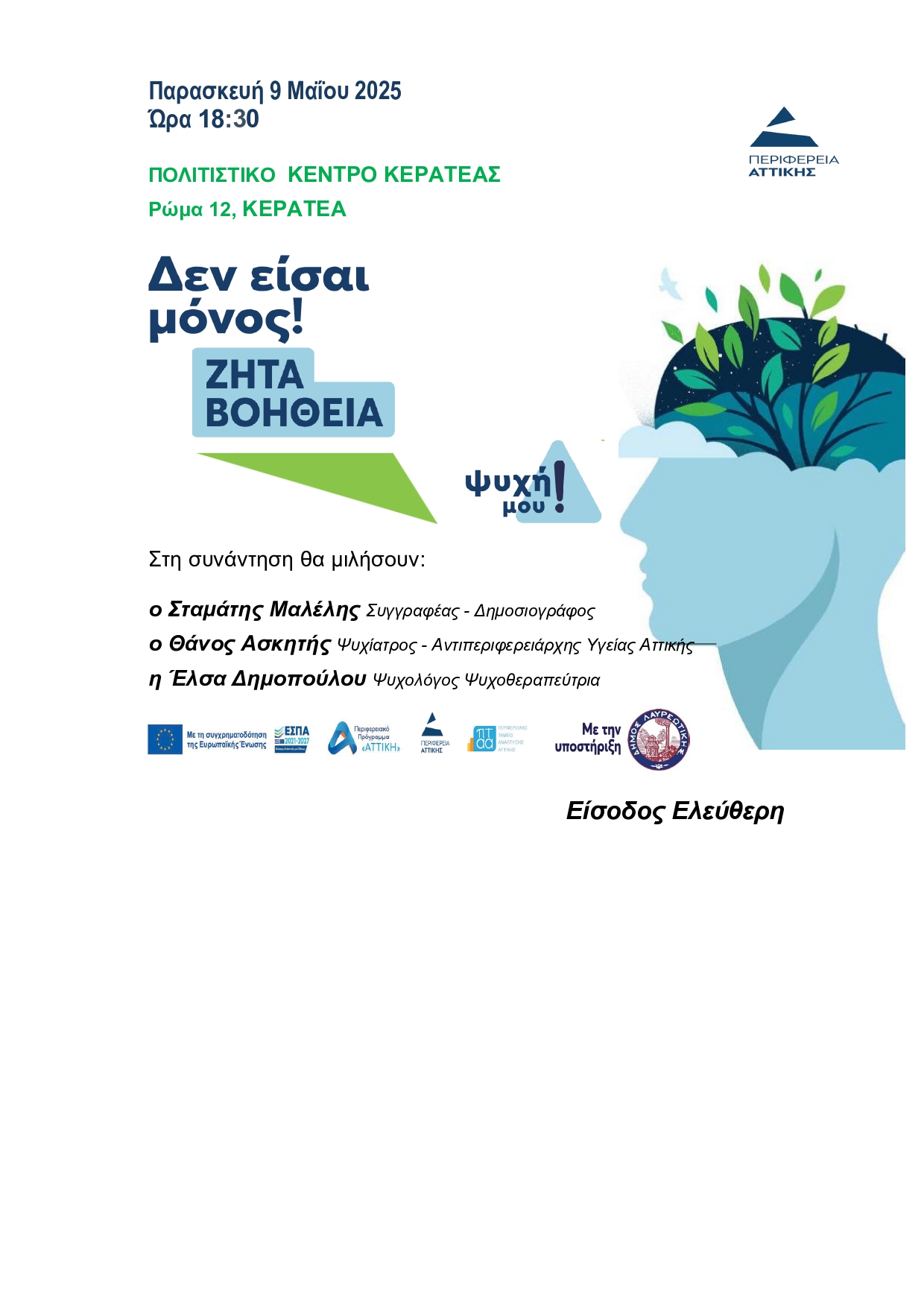 • Παρασκευή 9 Μαΐου στις 18:30, στον Δήμο Λαυρίου (Πολιτιστικό Κέντρο Κερατέας)