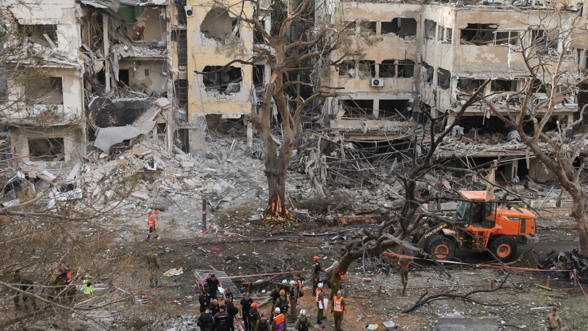 Emergency personnel work at an impact site after missiles were launched from Iran to Israel, in Tel Aviv, Israel, June 16, 2025. REUTERS/Ronen Zvulun