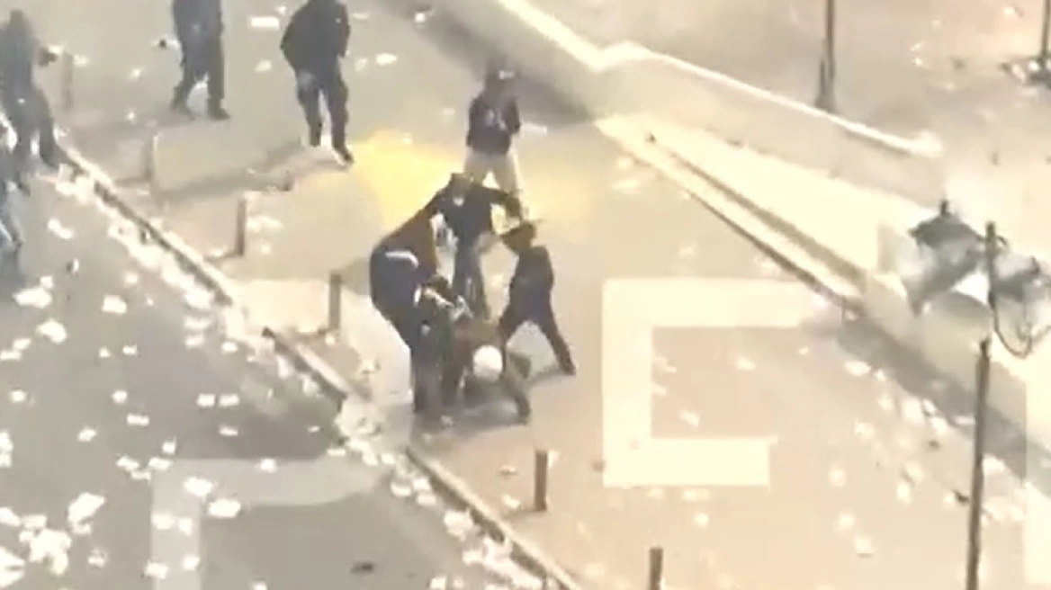 Μάλιστα, σε πλάνα που κυκλοφόρησαν, διακρίνονται οι κουκουλοφόροι να πετούν έναν άντρα των ΜΑΤ στο έδαφος και στη συνέχεια τον κλωτσούν και να τον γρονθοκοπούν. Μέσα σε λίγα δευτερόλεπτα, ωστόσο, έσπευσαν κι άλλοι αστυνομικοί για να τους απομακρύνουν και να σώσουν τον συνάδελφό τους.