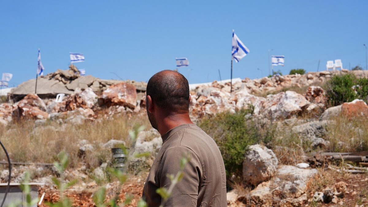 A Palestinian man looks at Israeli flags placed over a demolished Palestinian house after an Israeli settlers' attack in Bruqin village near Salfit in the Israeli-occupied West Bank May 23, 2025. REUTERS/Ismael Khader